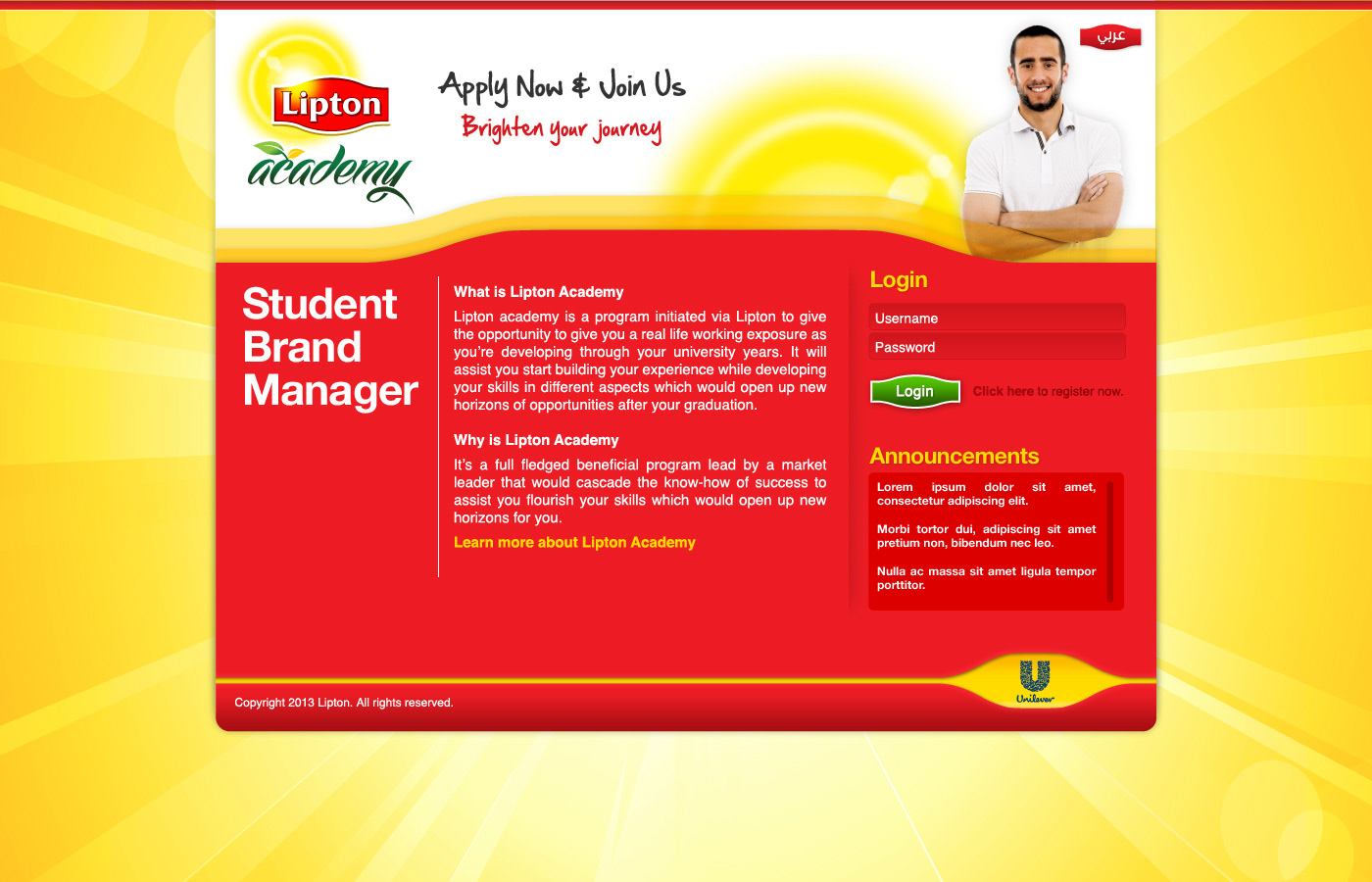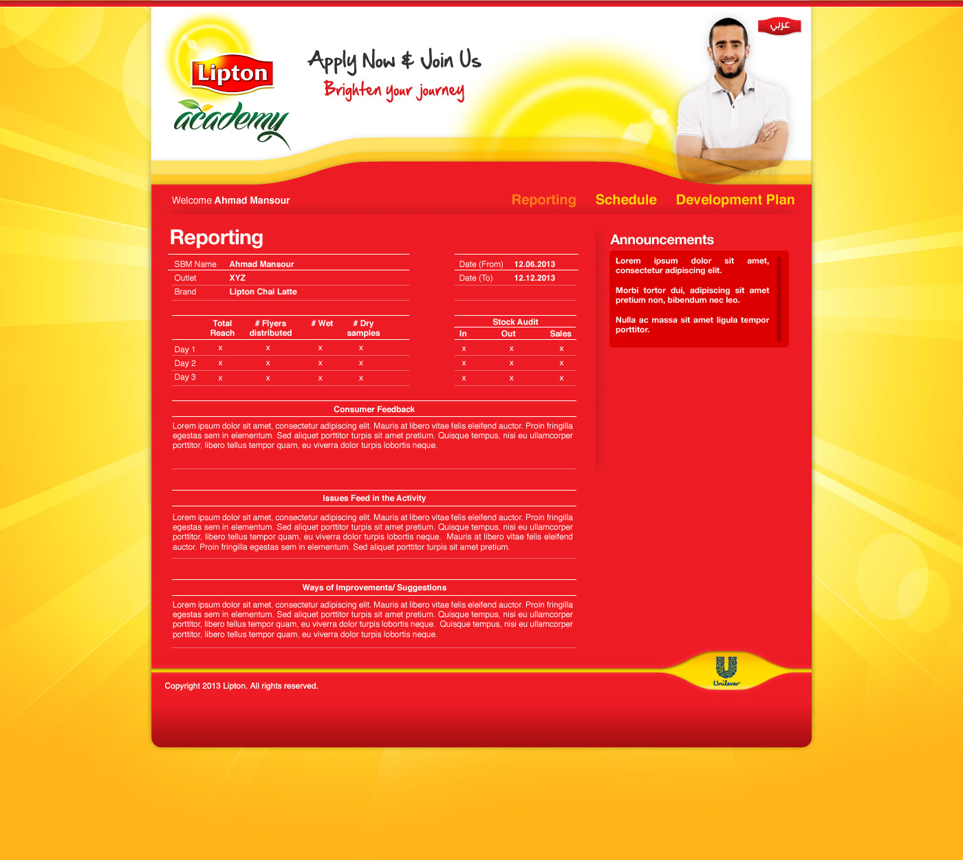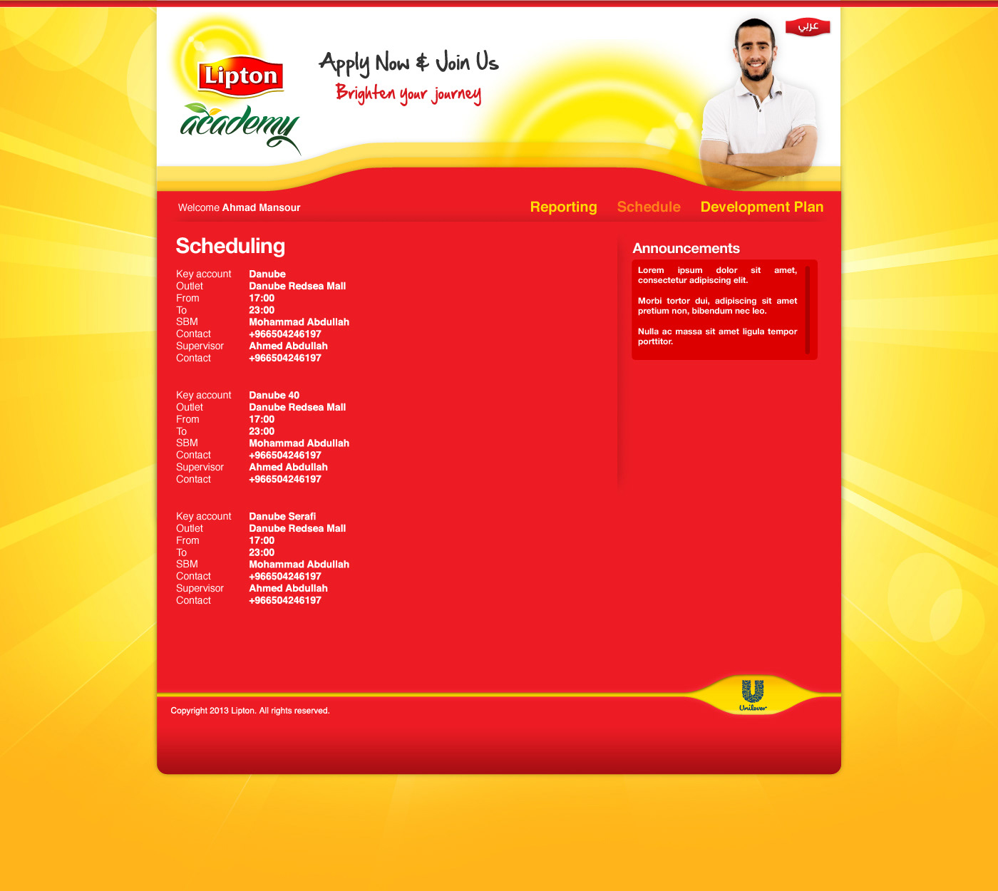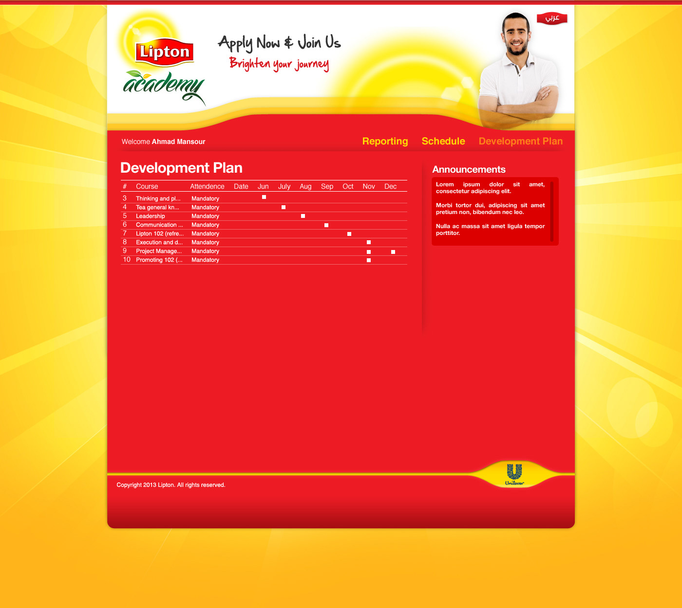 Lipton Academy is a project targeting university students providing them with and internship program at Lipton, the project consisted of a portal that allows students to view their schedule and development plan.