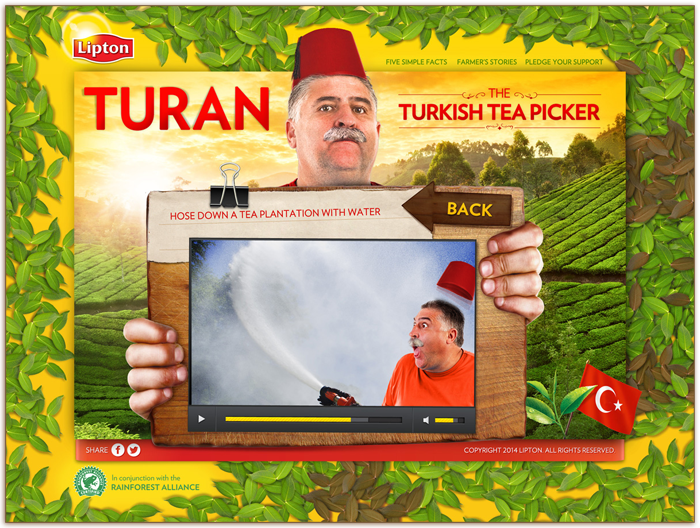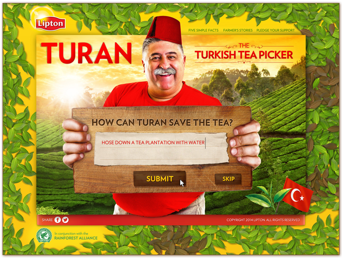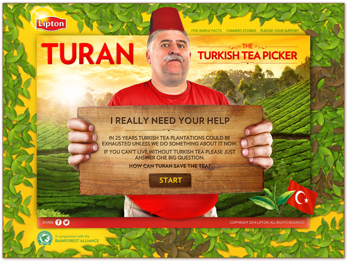 Lipton wanted to present their concern about the endangered tree plantations in Turkey by coming up with a fun microsite for the consumer to engage with. The idea revolves around our Turkish friend Turan, a loveable buffoon character, he is overweight and wears the traditional Turkish fez. Turan is a Turkish Tea Hero, all the action would be filmed with a real character once the idea gets approved. The microsite would start off with a quick demonstration of how it works, where the user would be asked by Turan to provide him with instructions on how the user thinks Turan can help... A group of videos would be filmed and the closest video to match the request made would be played. The engaging part is where users would be curious as to what action Turan would have for each request a user makes!